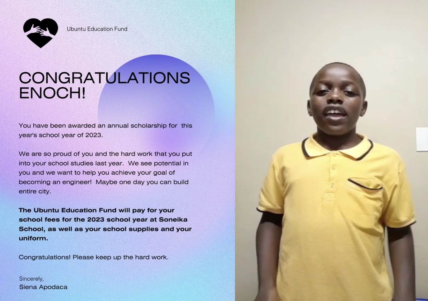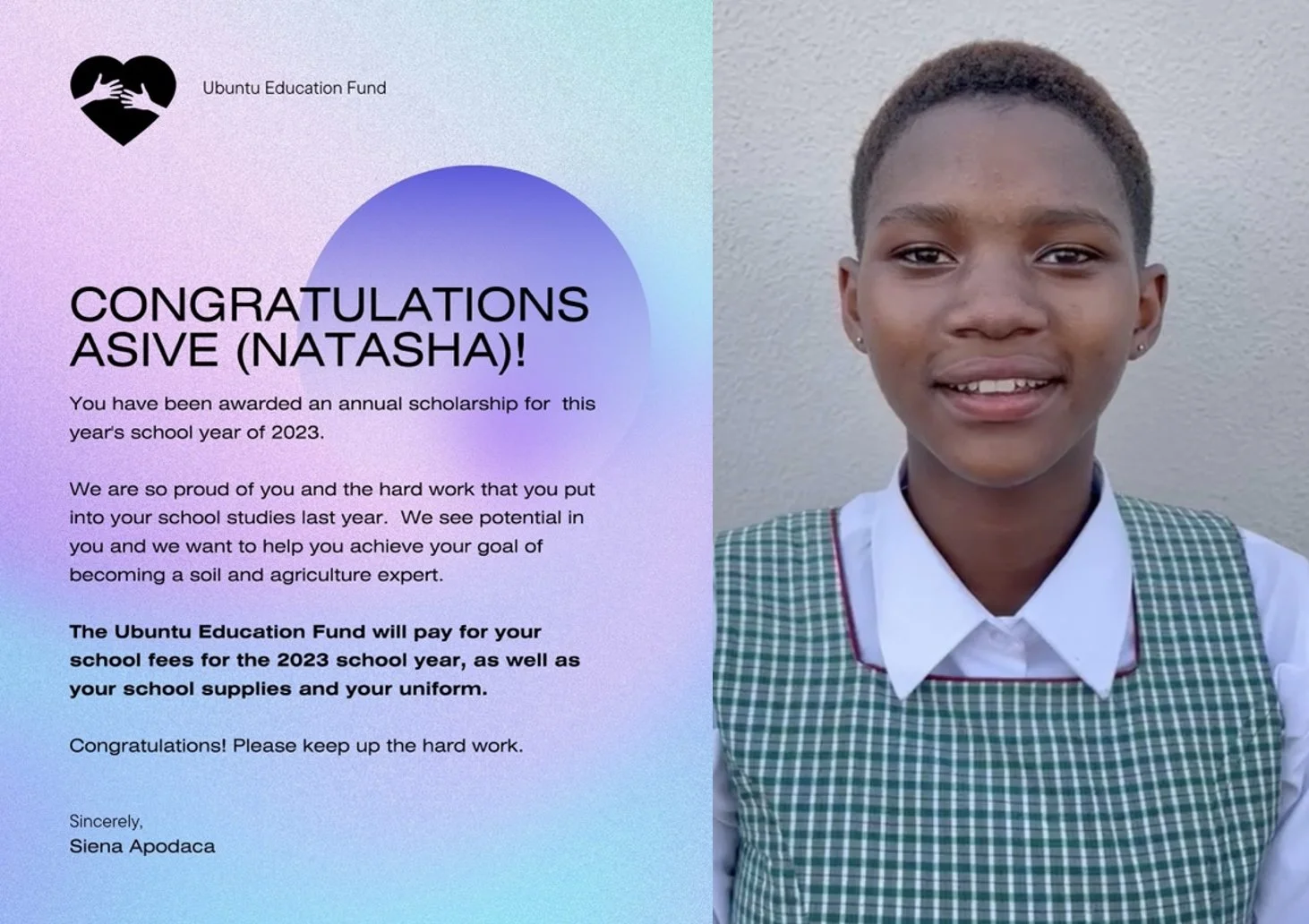 The “Ubuntu Education Dream Fund” helps children in Africa with their school fees, uniforms, and school supplies. Natasha, Enoch & Sharon have started their journey to help others through their education.